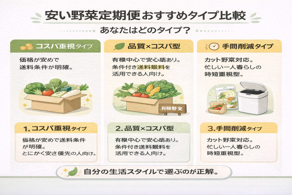 ここでは、一人暮らしでも安く使いやすい野菜定期便をタイプ別に紹介しますね。