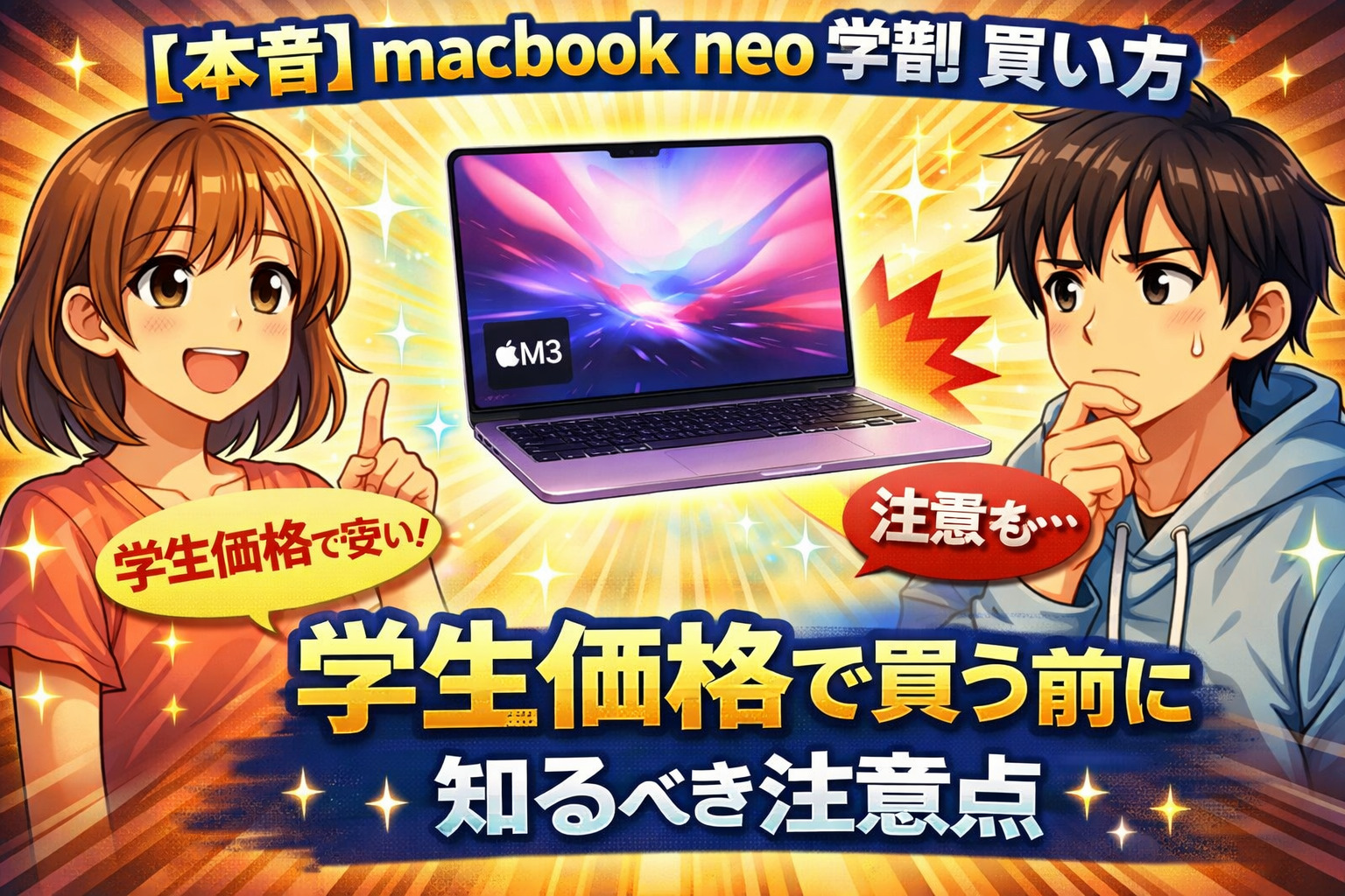 2026年に新たに登場した待望のエントリーモデル、「MacBook Neo(A18 Proチップ搭載)」。スタバでレポートを書いたり、軽い動画編集をしたりする学生にとってはこれ以上ない完璧な相棒ですが、通常価格の「99,800円」という金額を見ると、決して安い買い物ではありません。Amazonのセールを待つべきか、家電量販店のポイント還元を狙うべきか、迷っている人も多いはずです。