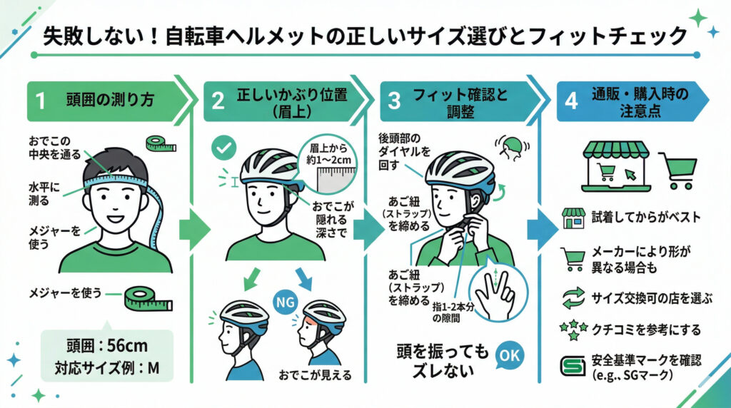 ヘルメット選びで大切なのは、見た目だけで決めず、安全性とサイズを最初に確認することです。