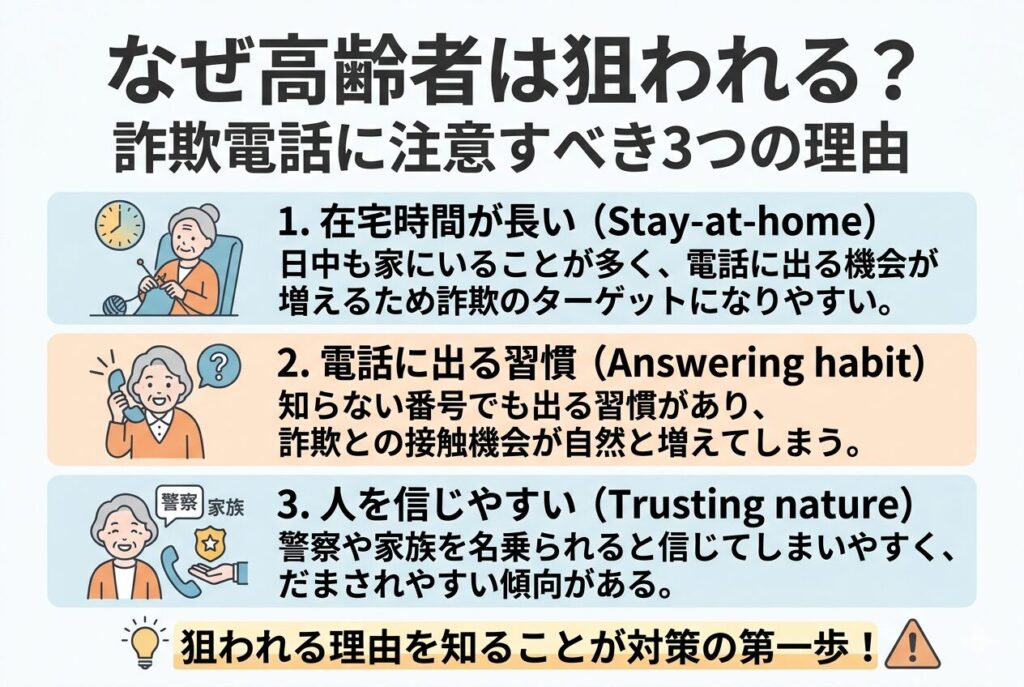 結論からいうと、高齢者は生活スタイルや心理的な特徴から、詐欺電話のターゲットにされやすい傾向がありますね。
