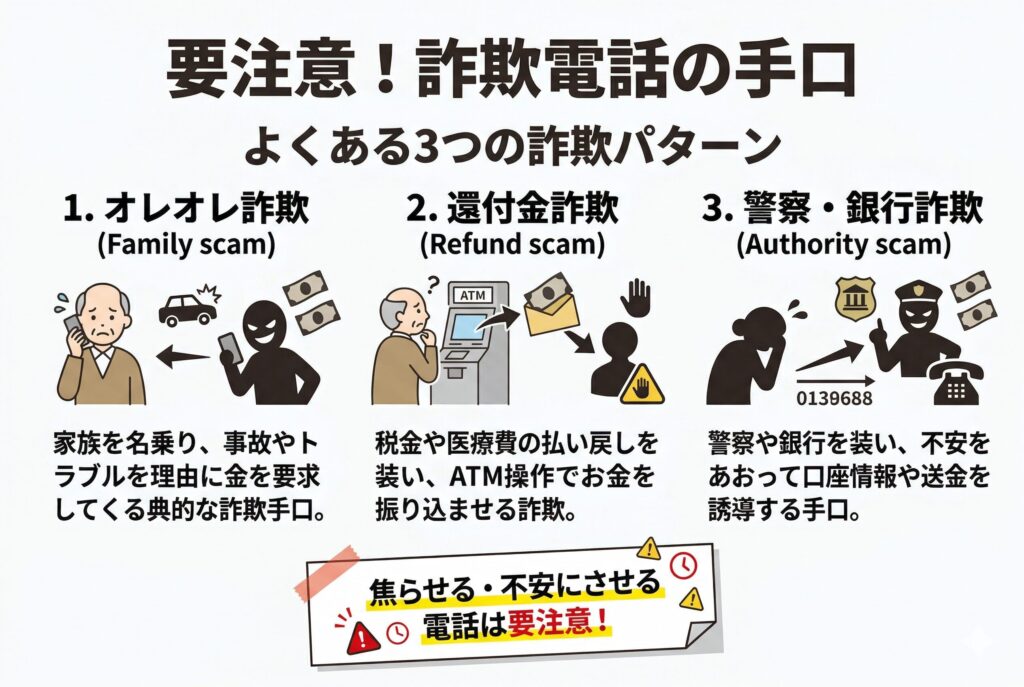 高齢者を狙う詐欺電話の代表的な手口について、具体的に解説していきますね。