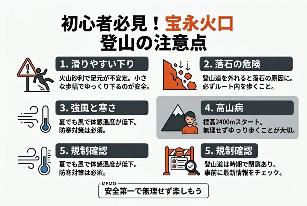 宝永火口登山は初心者でも楽しめるルートですが、安全に歩くためには事前に知っておくべき注意点があります。